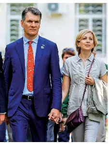 Baikonur Kazakhstan 27th July 2017 Italian Astronaut Paolo Nespoli Esa Left A Member Of Iss Expedition 52 53 Prime Crew And His Wife After A Press Conference On The Launch Of A Soyuz Fg